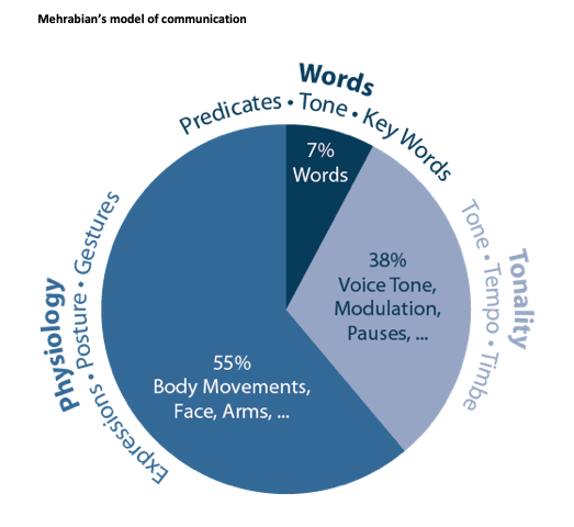 6. Consider Mehrabian’s ‘Impact in communication’ model – This well-evidenced research suggests that the vast majority of communication is understood as a result of accompanying body language and tone of voice, rather than words. In terms of what this means for virtual communication, remember that written communication (emails, texts, messages, memos) will not have sufficient impact, and during video sessions much of the nuance of body language such as hand gestures will be lost in a small gallery, head and shoulders view. Actively ask for feedback and express important messages using intonation and impactful visuals.